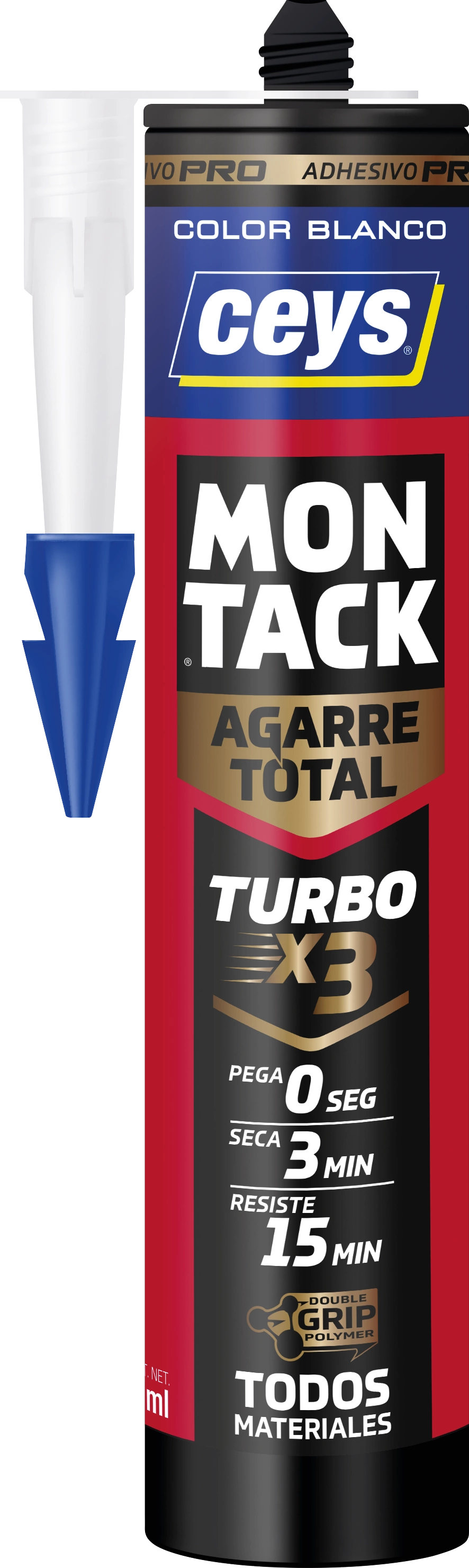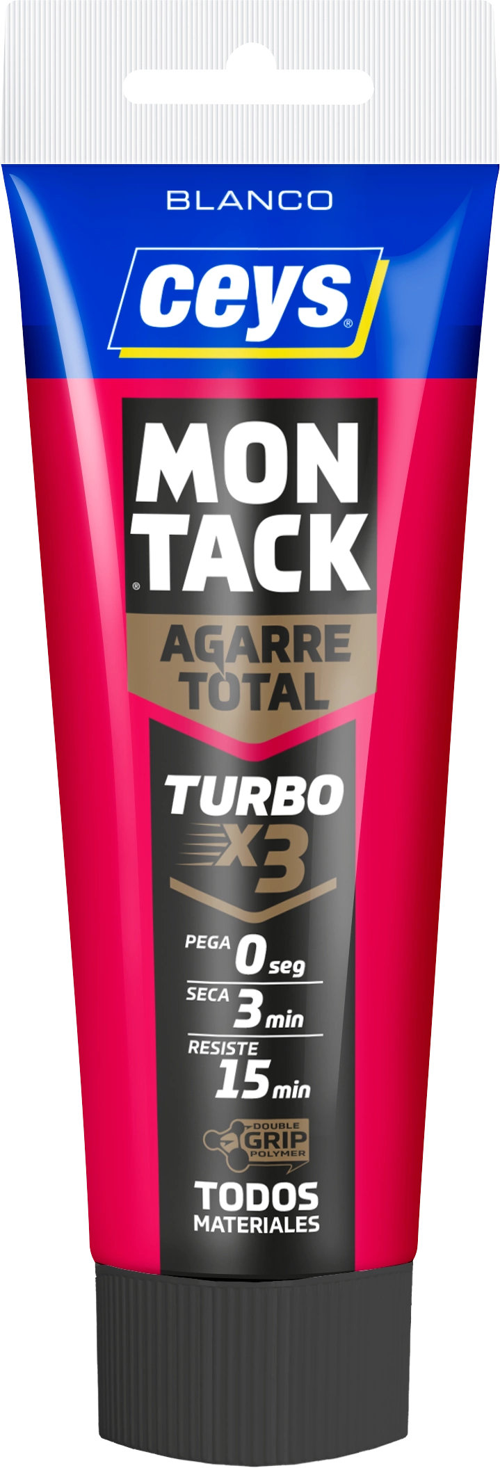 Adhesivo de montaje TURBO de Agarre Total. Gracias a su tecnología exclusiva DOUBLE GRIP pega y fija ULTRA RÁPIDO y fuerte. Las piezas quedan fijadas a los 15 min.