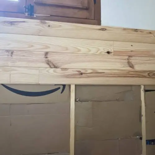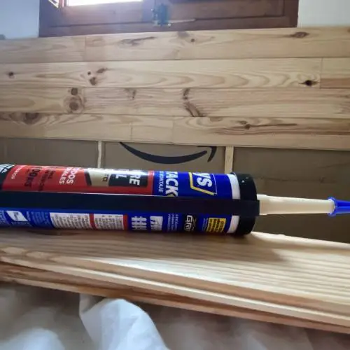 A continuación lo único que tenemos que hacer ir cortando las lamas de madera para que las uniones queden descuadradas y vamos aplicando adhesivo de montaje ceys y colocando las lamas.