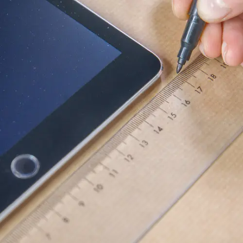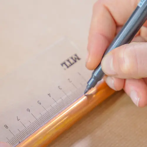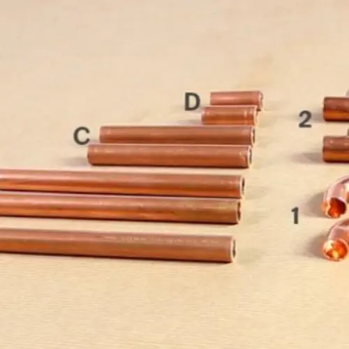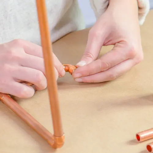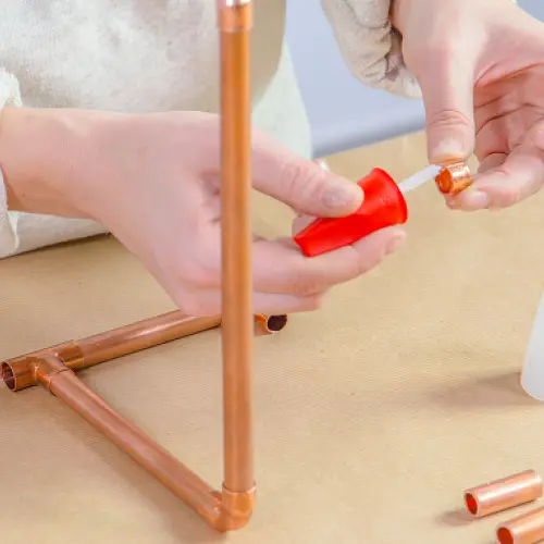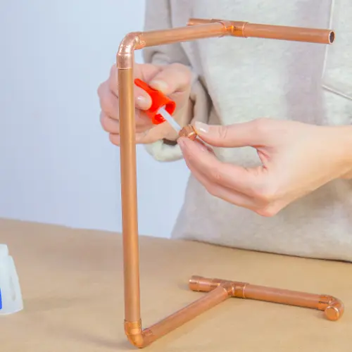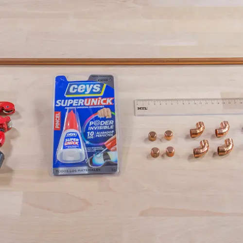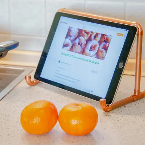 La estructura está formada por siete tubos de cobre de diferentes tamaños. La parte vertical está formada por tres tubos que soportan la tablet. La otra por cuatro tubos que actúan como patas, unidos a la estructura superior por una T de cobre: dos cortos a un extremo y dos más largos a otro.