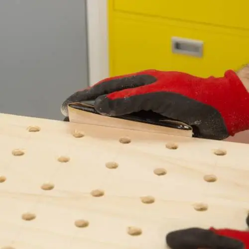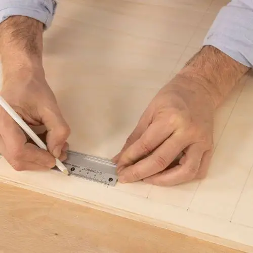Dibuja una cuadrícula con la ayuda de un lápiz, un flexómetro y una escuadra. Traza las líneas sobre la madera, calculando la distancia que quieras que haya entre los agujeros.
