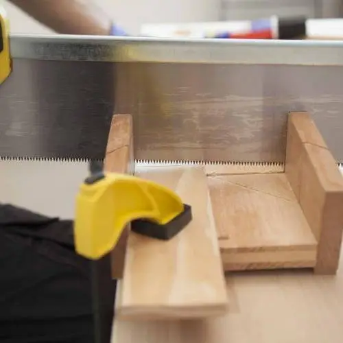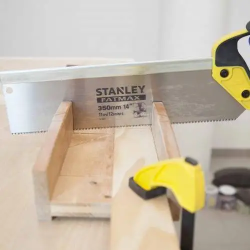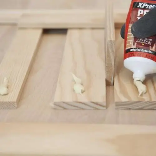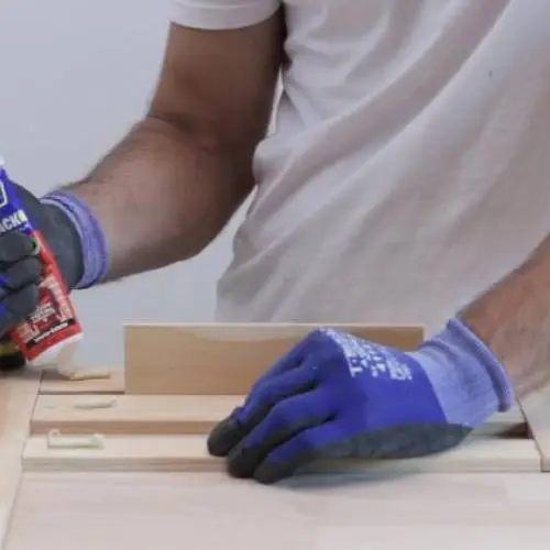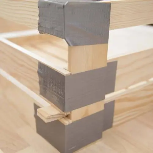 Pega el listón vertical de unión a los listones horizontales con CEYS MONTACK XPRESS Pega los listones horizontales sobre las piezas de unión verticales. Ayúdate de una escuadra para colocar rectas todas las piezas y en ángulo recto. Para que no se muevan mientras se secan, utiliza cinta americana. Deja secar una hora.