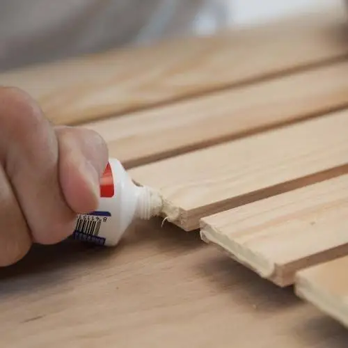 Pega las piezas de madera que formarán la base con el adhesivo de montaje CEYS MONTACK XPRESS. Para formar la base de la caja, coloca los dos listones transversales y sobre ellos ve pegando los listones longitudinales con el adhesivo de montaje, separados unos de otros a la misma distancia. Deja secar 1 hora.