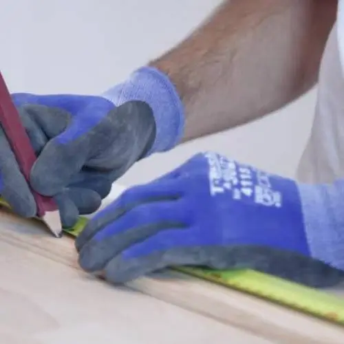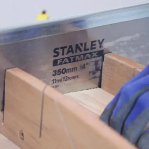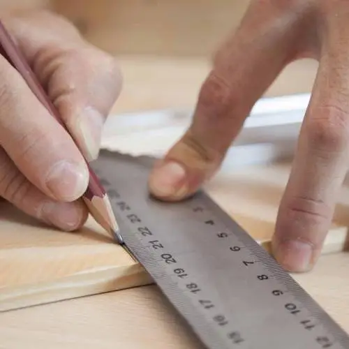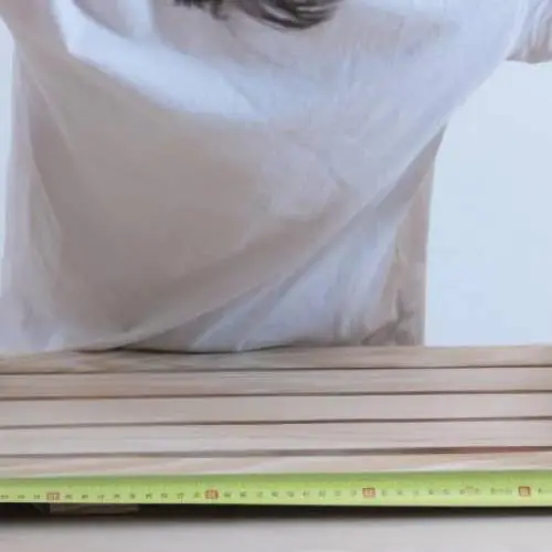 Mide y marca los listones que formarán los lados transversales Una vez tengas la base hecha, comienza con los lados más cortos de la caja.Los listones se unirán mediante otros listones colocados en vertical. Para cortarlos, tienes que sumar dos veces el grosor del listón. En nuestro caso hay que sumar 2 cm (el listón tiene un grosor de 1 cm).