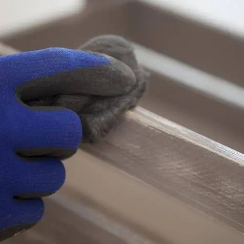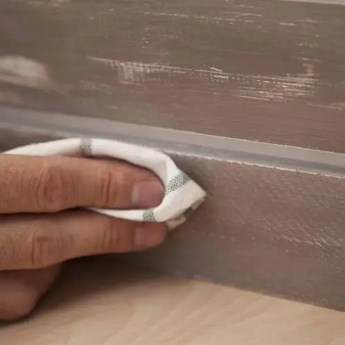 Pinta la caja. Para que la caja tenga un efecto decapado, empieza con el lasur. Aplica dos capas, para un acabado más opaco (dejando secar entre una y otra). Una vez seco, aplica una capa con la pintura efecto tiza. Cuando seque, usa una lana de vidrio ('nanas') o una lija de grano muy fino para ir quitando la pintura.