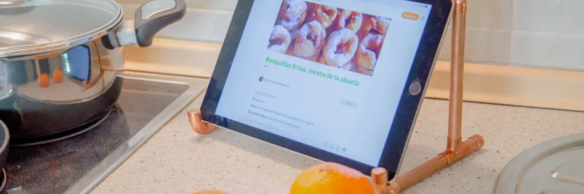 La estructura está formada por siete tubos de cobre de diferentes tamaños. La parte vertical está formada por tres tubos que soportan la tablet. La otra por cuatro tubos que actúan como patas, unidos a la estructura superior por una T de cobre: dos cortos a un extremo y dos más largos a otro.