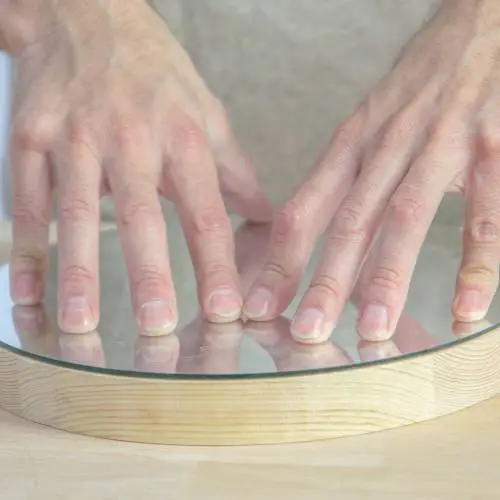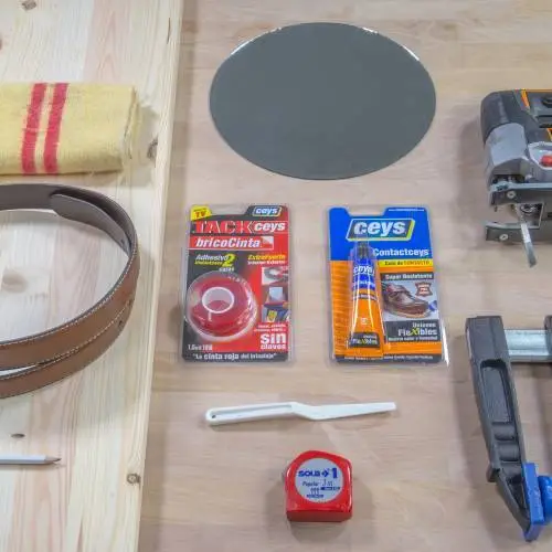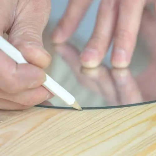 Situar el espejo redondo sobre un tablero grueso de madera y marcar su contorno con un lápiz. Esta pieza servirá de base de madera para colocar el espejo.