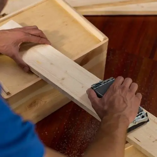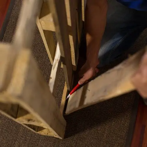 Con la ayuda del martillo y el cincel vamos desmontando las tablas del palet.