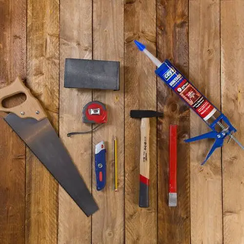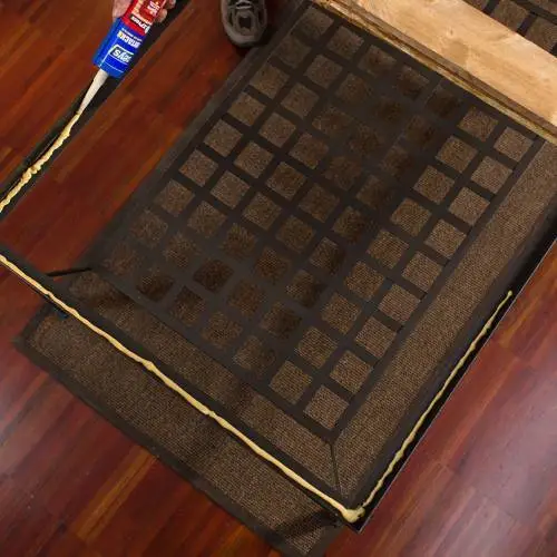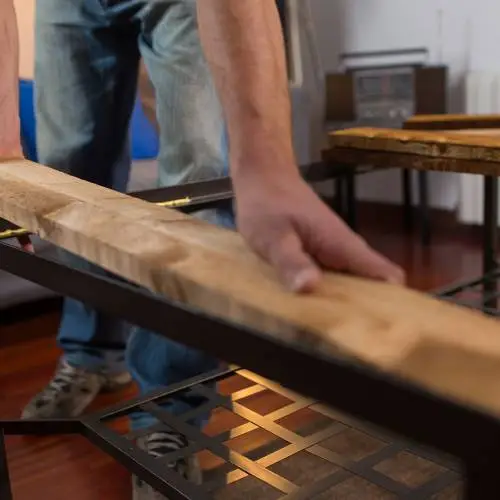 Vamos encajando las tablas sobre la estructura metálica y presionando las piezas para que queden bien pegadas. Vamos aplicando producto en el resto del contorno y seguimos colocando las tablas que faltan.