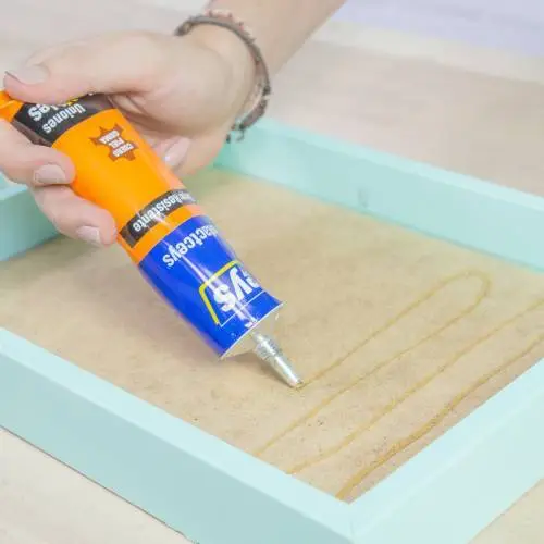 Aplicar cola de contacto en todas las superficies a unir -números, corcho y la base del marco- y dejar secar hasta que se pueda tocar la cola de contacto sin que se formen hilos.