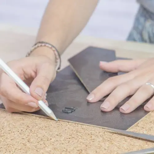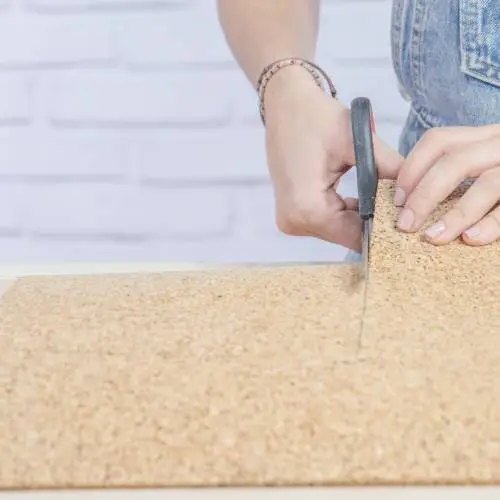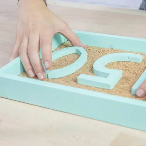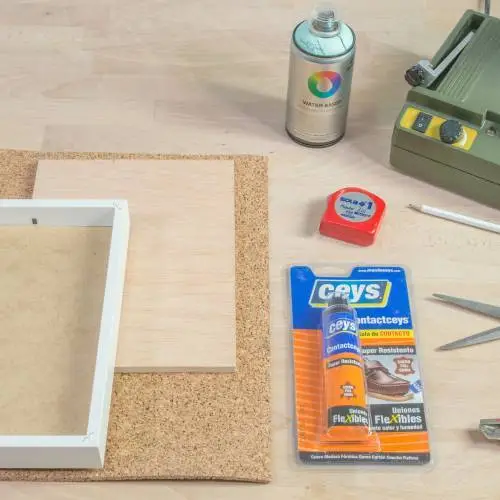 Para la forma de la pieza, utilizar un marco de fotos y con la ayuda de un lápiz marcar las dimensiones en la placa de corcho.