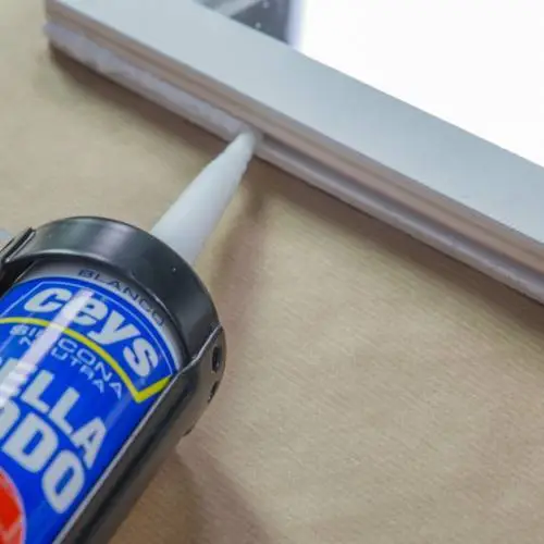 Sellar las juntas entre las dos bases de madera con Silicona Sellatodo. Inmediatamente, alisar la silicona pasando por encima el dedo humedecido.