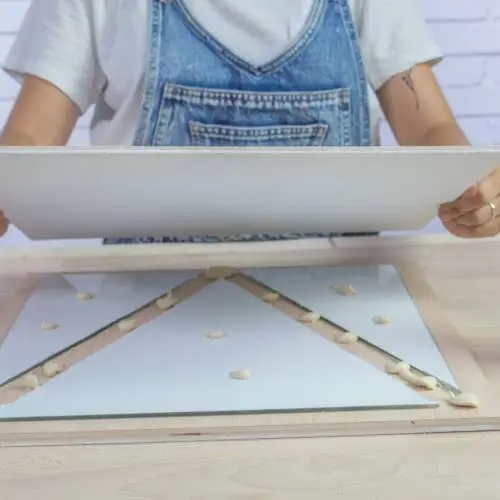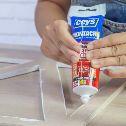 Aplicar generosamente adhesivo de montaje Montack Xpress por la madera y los espejos y colocar la base del espejo.