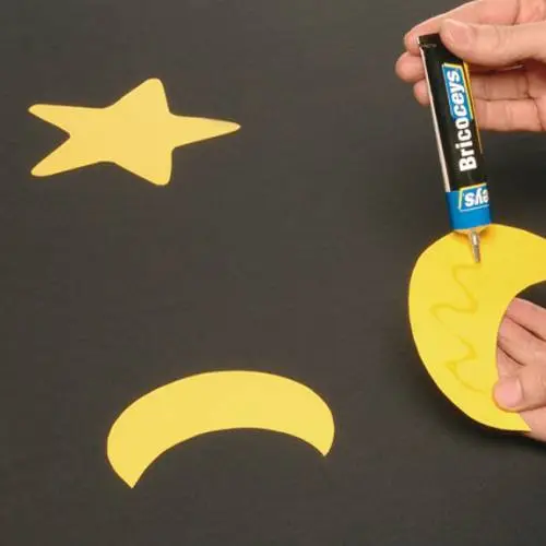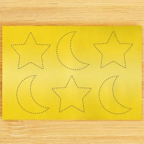Si queremos decorarlo, dibujamos estrellas y lunas de diferentes tamaños sobre la cartulina amarilla.