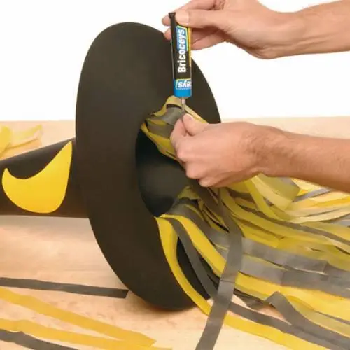 Con el papel de seda hacemos tiras de unos 40 cm de largo por 2 cm de ancho en amarillo y negro. Las pegamos en el interior y en la base del gorro con el adhesivo Bricofácil Especial Bricolaje para simular una peluca, dejando libre la zona de la cara.
