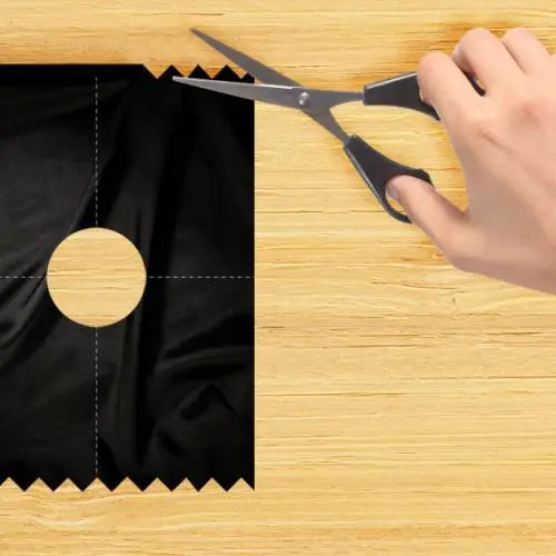 Para realizar el vestido, empezamos doblando la tela en cuatro partes. Primero por la mitad y luego, otra vez por la mitad. Recortamos una esquina para hacer el hueco por donde tendrá que pasar la cabeza.