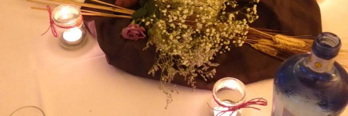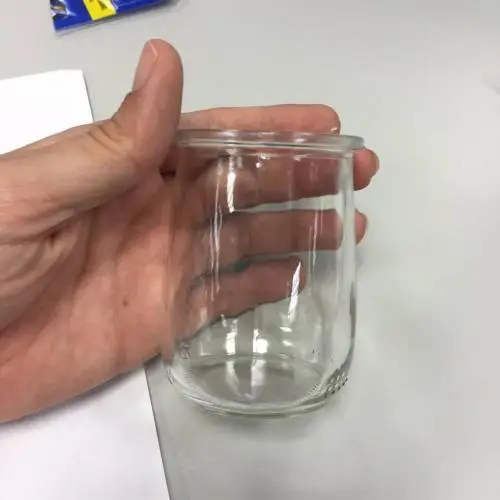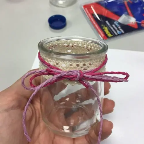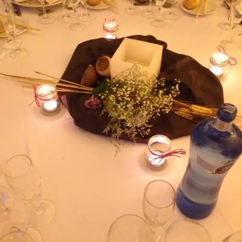Utilizamos los típicos vasitos de yogurt de cristal de toda la vida. En total 44 ya que teníamos 11 mesas y queríamos poner unos 4 por mesa para dar luminosidad alrededor del centro grande.
