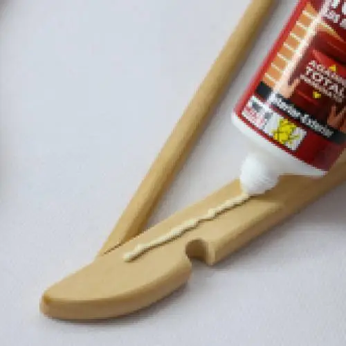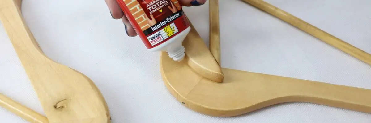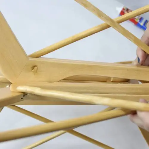 Unir las dos piezas que tenemos entre sí como si de un puzzle se tratara. De este modo quedan completamente formadas las patas. Para ello aplicamos de nuevo una buena cantidad de pegamento en los centros de las perchas y las unimos.