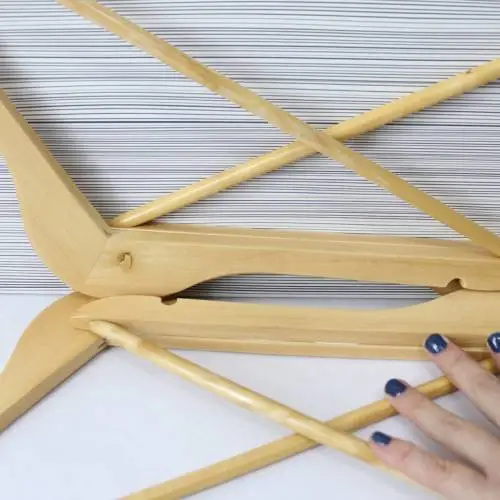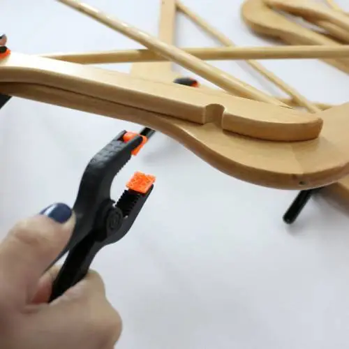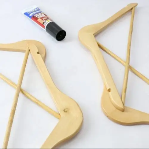 Pegar ambas perchas consiguiendo que la parte de abajo de la percha (dónde colgaríamos el pantalón) forme una X con la otra percha. Al principio el pegamento deja mover las piezas para poder centrarlas lo mejor posible.