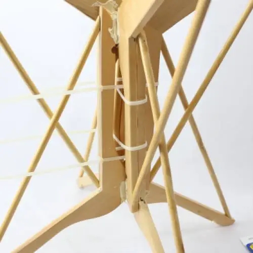 Unir de dos en dos para continuar dando forma a la mesa. Para ello las unimos simétricamente formando un ángulo de 90 grados. Nos tienen quedar ahora dos piezas formadas por 4 perchas cada una.