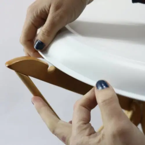 Pintar el revés de la bandeja con pintura en spray y encajarla en la estructura. Aprovechar las hendiduras de la percha.