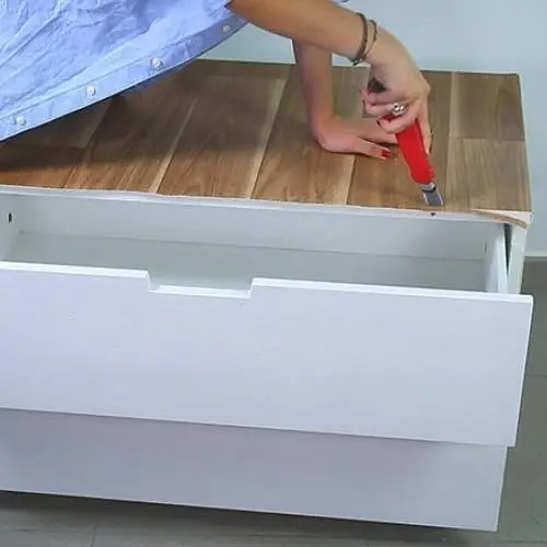 Cortar el vinilo sobrante para ajustarlo bien a ras de cómoda.