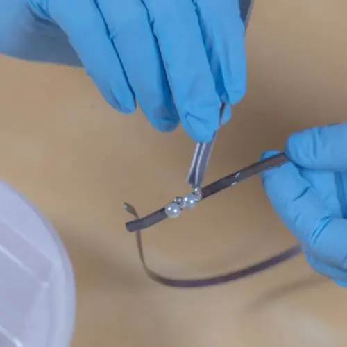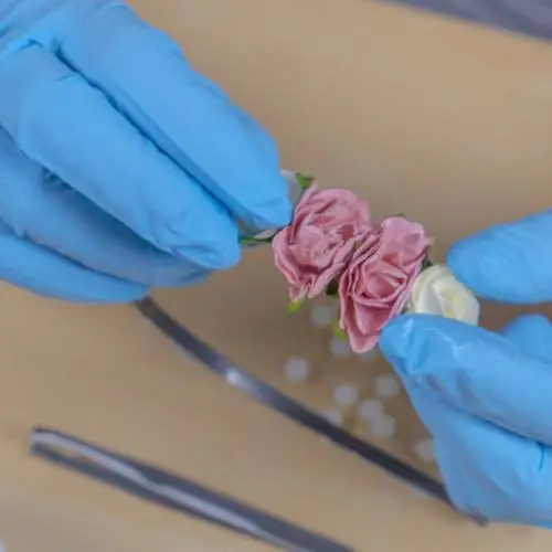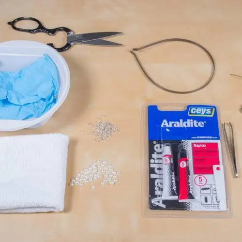 Aplicar una capa fina de la mezcla del adhesivo sobre las dos superficies y, con las pinzas metálicas, situar los adornos sobre la diadema.