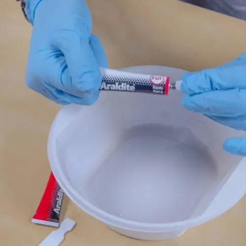 Preparar el adhesivo: sobre una superficie desechable, poner dos partes iguales de cada uno de los tubos. Mezclar bien con la espátula hasta que quede una mezcla homogénea.