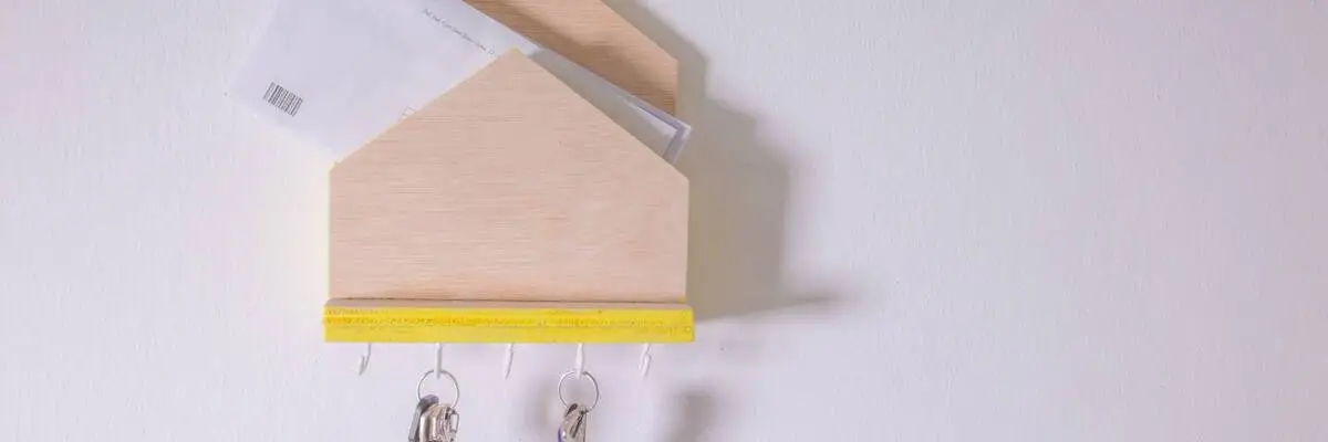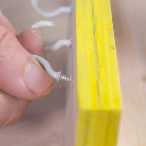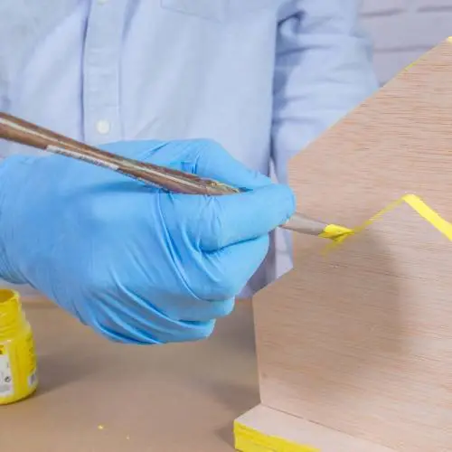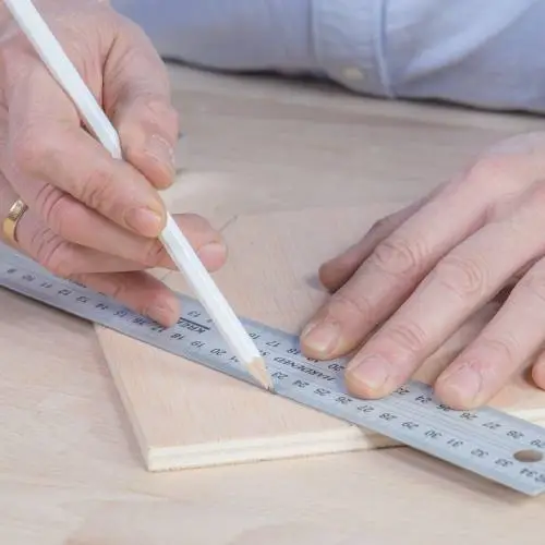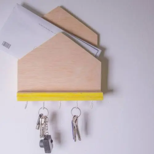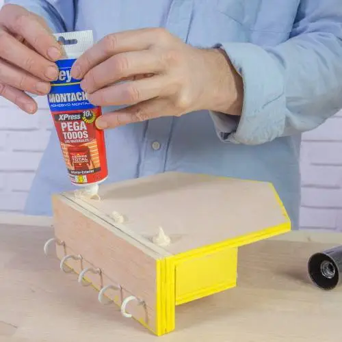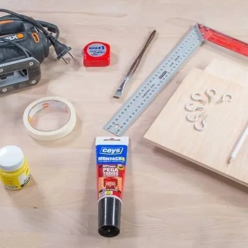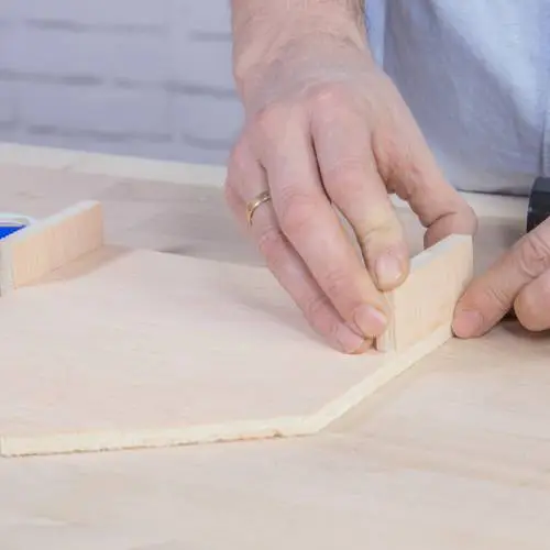 Mide y corta las piezas. Con el lápiz y la escuadra traza las líneas sobre la madera para definir las piezas. Debes dibujar 2 rectángulos de madera (20x7,5cm), 1 pieza en forma de casa (21cmx20cm), 1 pieza en forma de casa más pequeña (14x20cm) y 2 separadores (3x6cm). Una vez hecho, corta las piezas con una sierra de calar y líjalas.