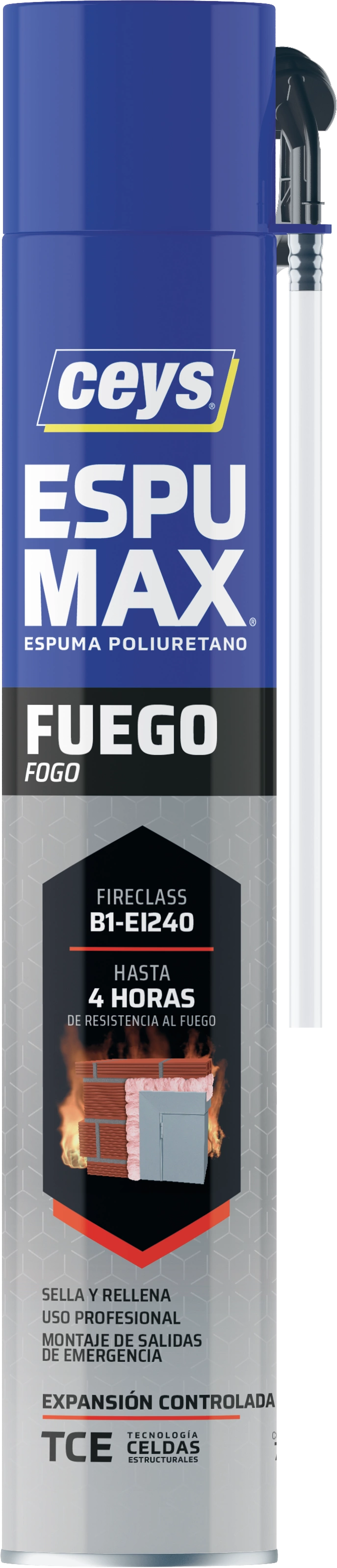 Espumax PU Fuego es una espuma monocomponente indicada para el relleno, fijación y aislamiento donde se requiera una clasificación de reacción al fuego B1 y una resistencia al fuego de hasta 4 horas (RF 240).