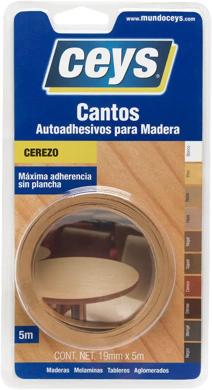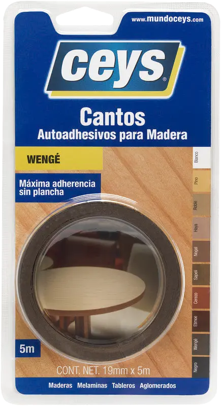 Los cantos autoadhesivos para madera, se adhieren directamente sin necesidad de plancha ni cualquier otra fuente de calor. Quedan perfecta y definitivamente pegados. Para uso profesional y bricolaje. Aplicable en todo tipo de tableros, aglomerados, melaninas y maderas en general. Por su flexibilidad, se adapta perfectamente a bordes curvos. 9 colores a elegir: blanco, negro, pino, haya, wengé, sapelli, cerezo, roble y nogal.