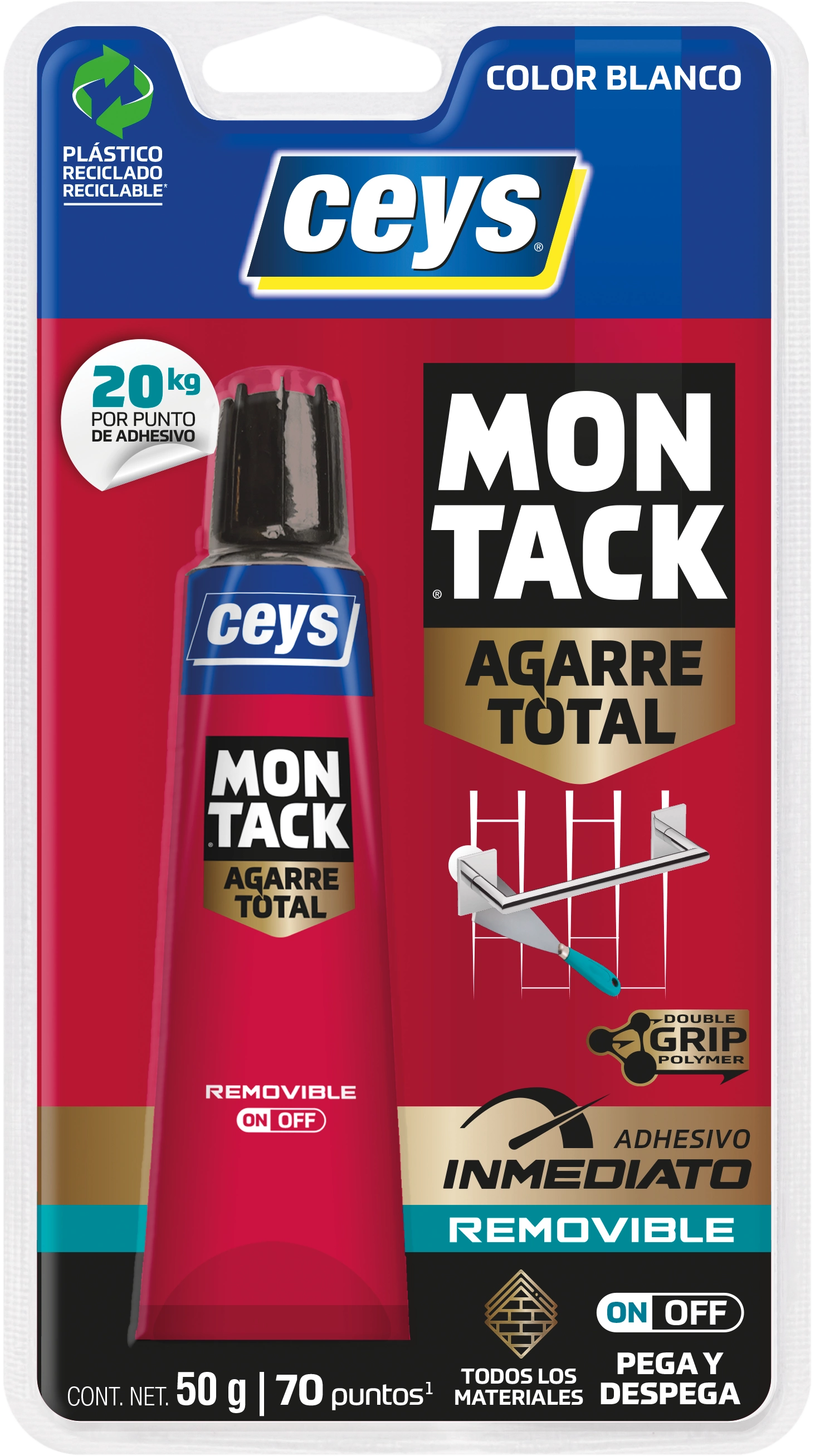 Adhesivo de montaje Removible de Agarre Total, que fija FUERTE y permite DESPEGAR fácilmente. Especialmente indicado para fijar accesorios y elementos de decoración gracias a su pegado fuerte y duradero, y a su vez permite despegar cuando quieras, de forma fácil y limpia, sin dejar rastro.