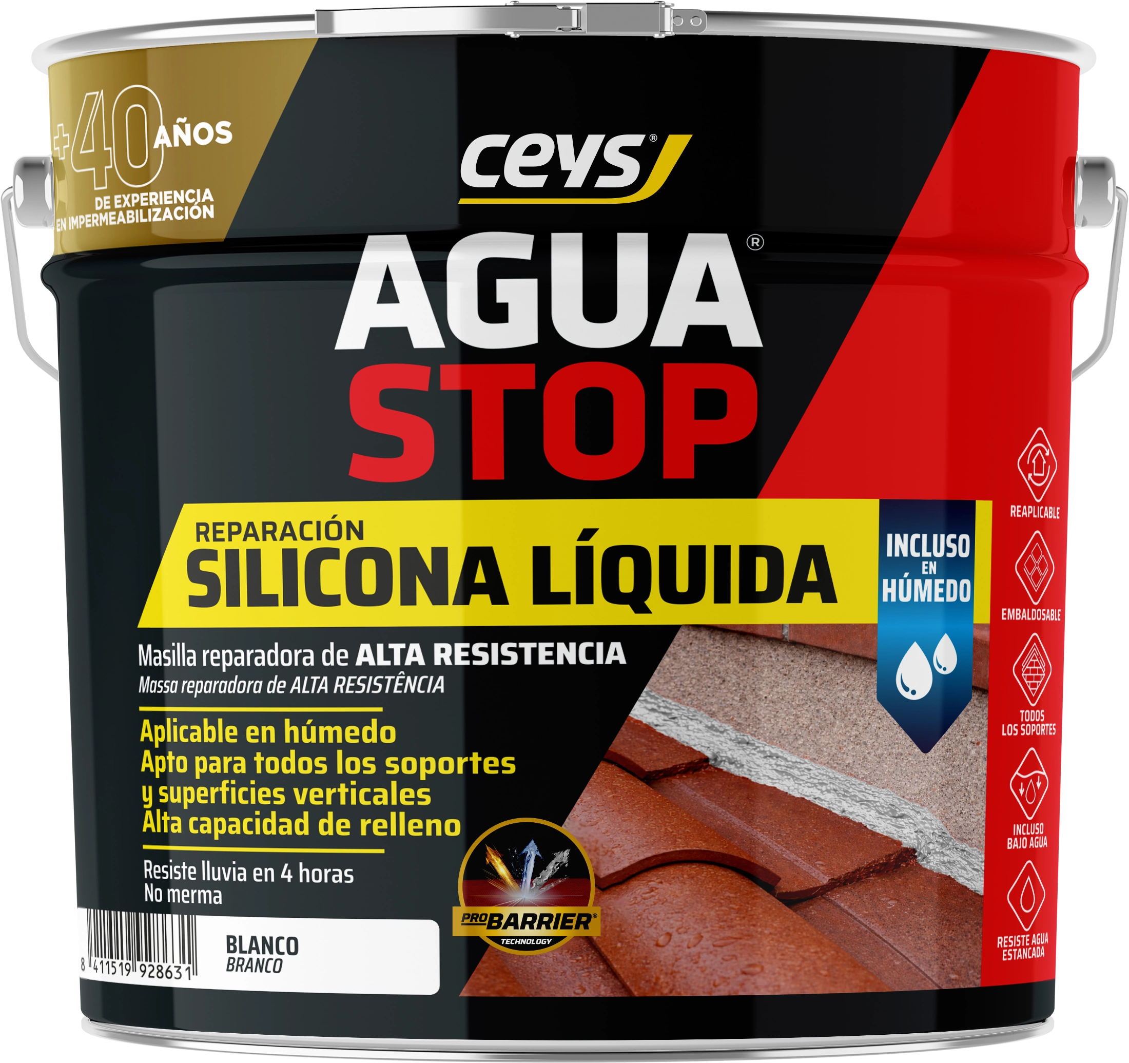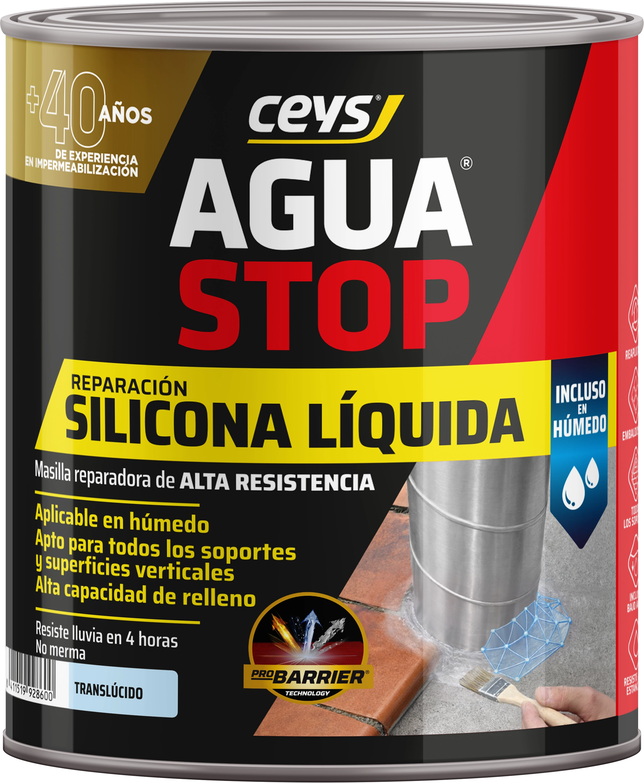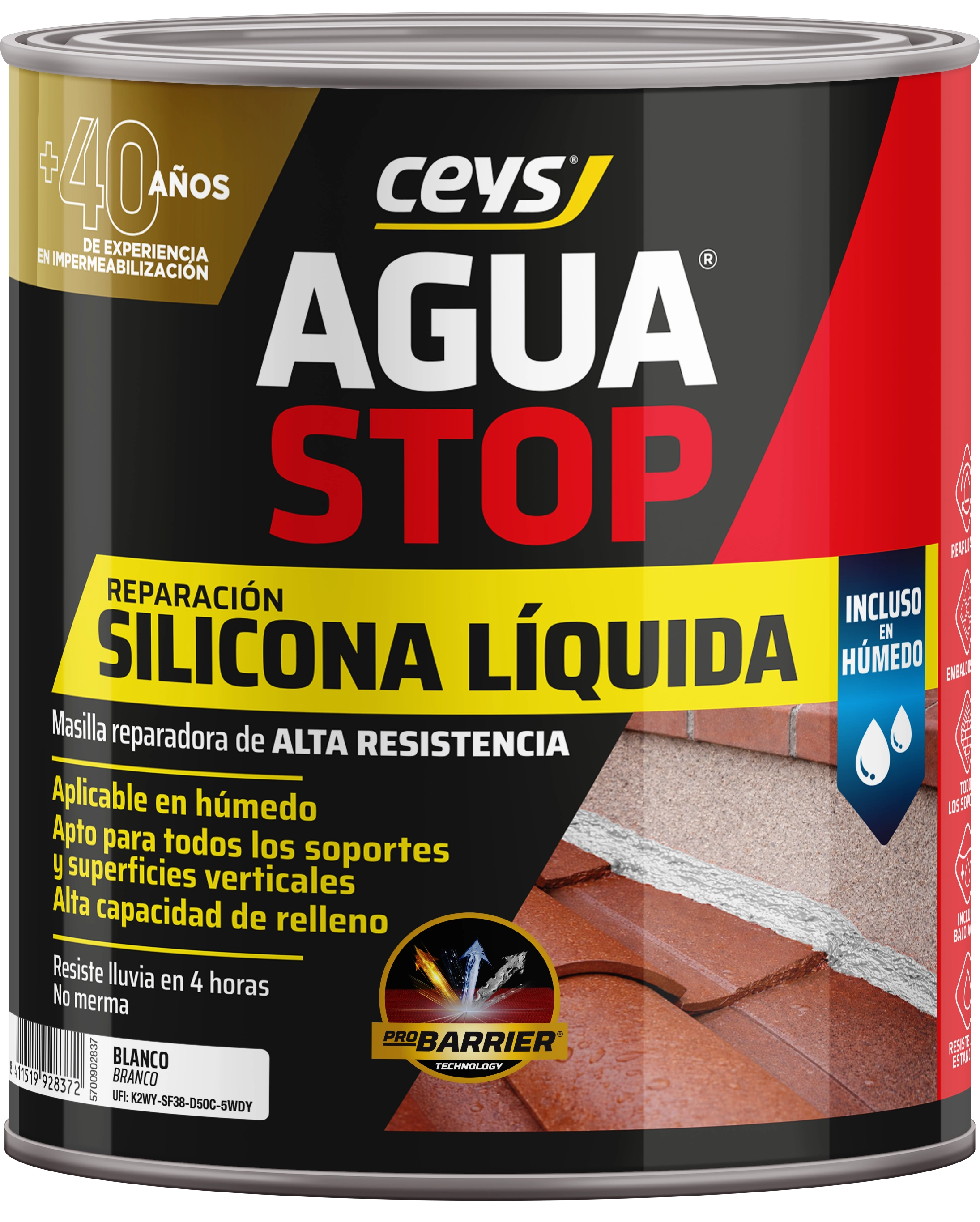 AGUASTOP SILICONA LÍQUIDA REACTIVA es una masilla reparadora de última generación. Su exclusiva fórmula de silicona líquida reactiva permite la aplicación sobre superficies húmedas y en todo tipo de soportes. Es apta para aplicaciones en vertical y tiene una alta capacidad de relleno. Esta especialmente diseñada para reparar fisuras, grietas y pequeñas fugas.