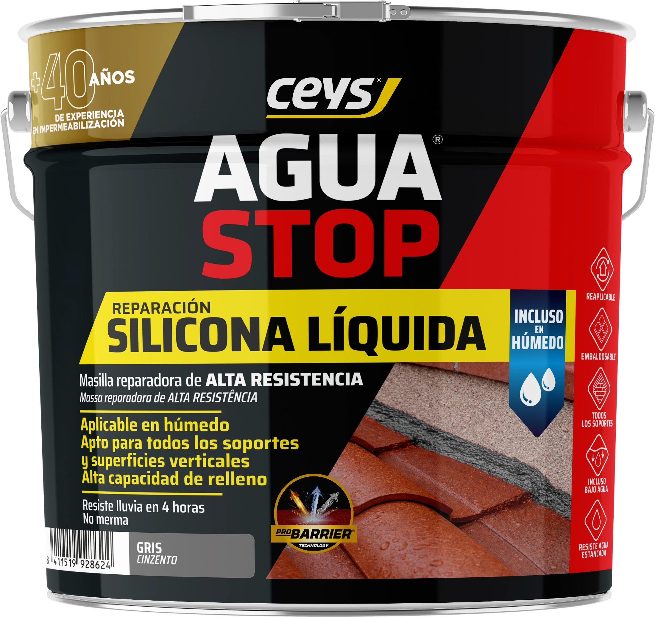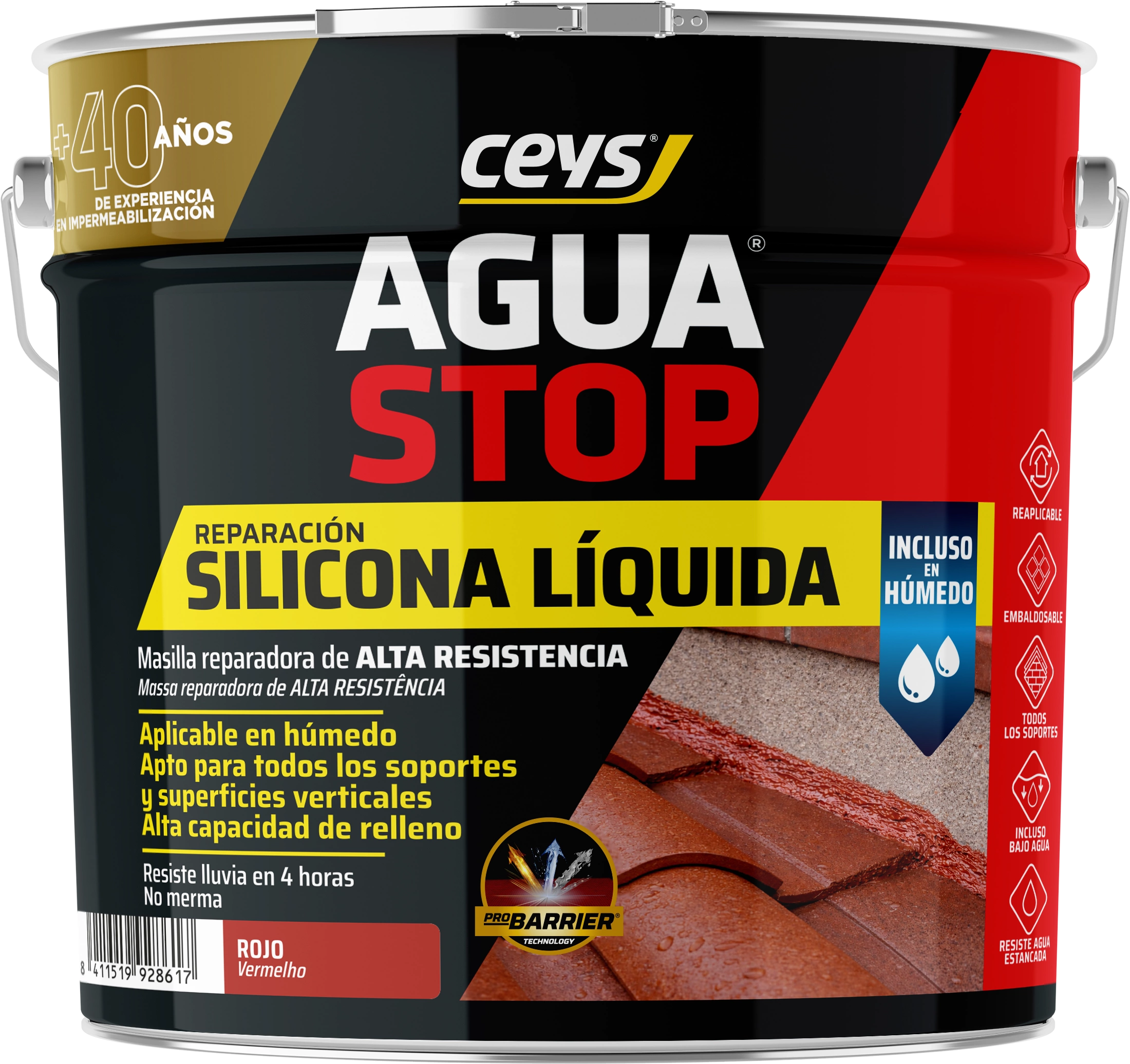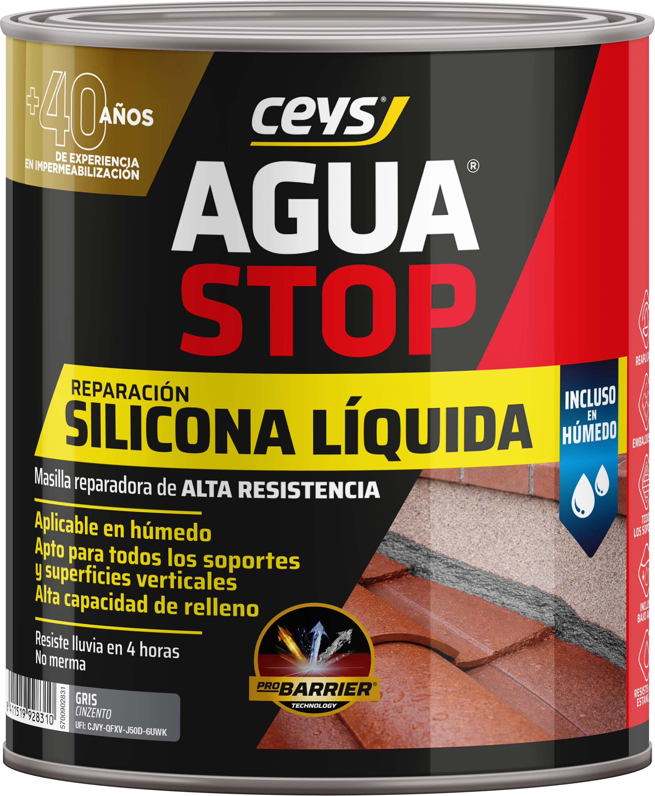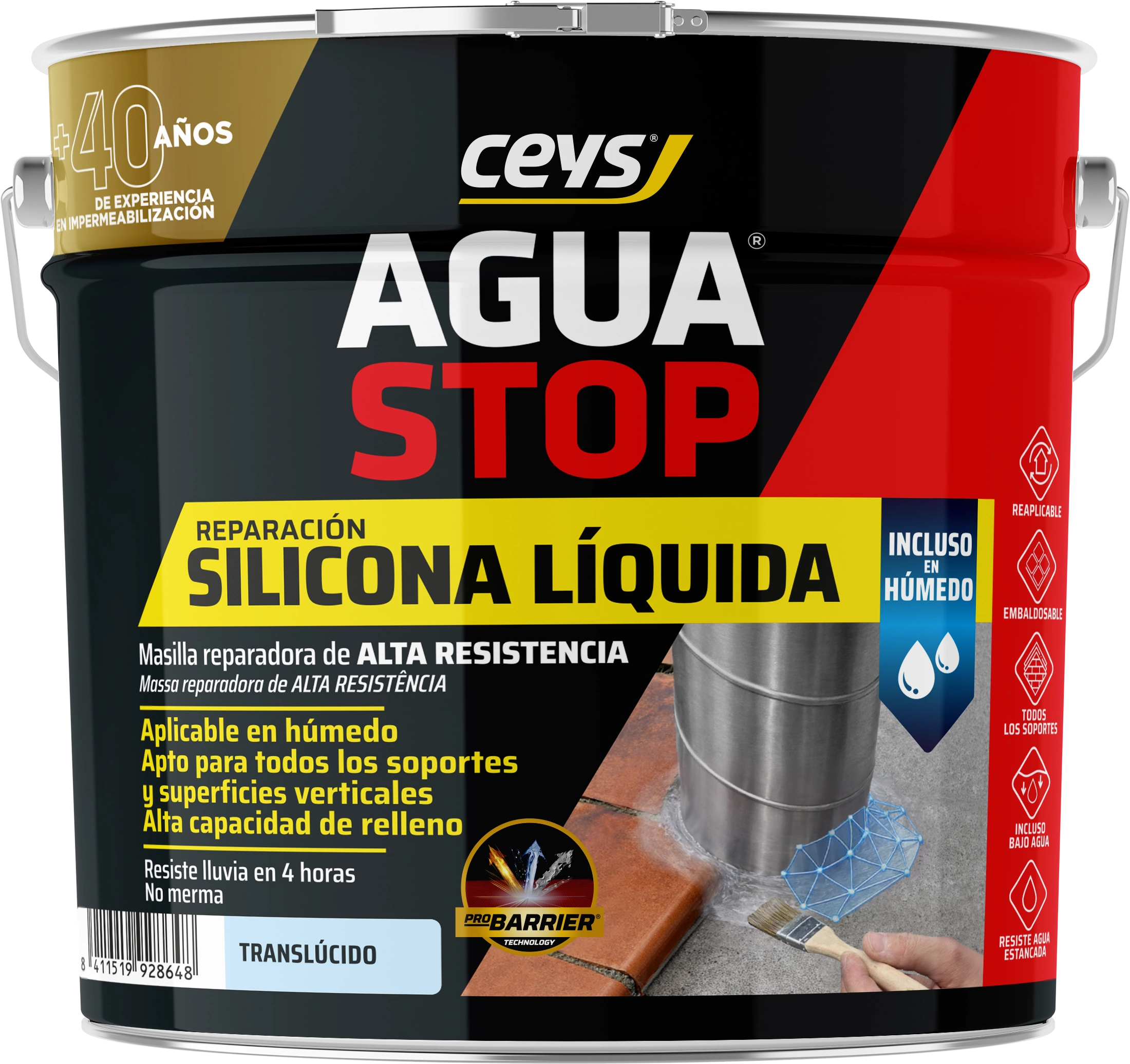 AGUASTOP SILICONA LÍQUIDA REACTIVA es una masilla reparadora de última generación. Su exclusiva fórmula de silicona líquida reactiva permite la aplicación sobre superficies húmedas y en todo tipo de soportes. Es apta para aplicaciones en vertical y tiene una alta capacidad de relleno. Esta especialmente diseñada para reparar fisuras, grietas y pequeñas fugas.