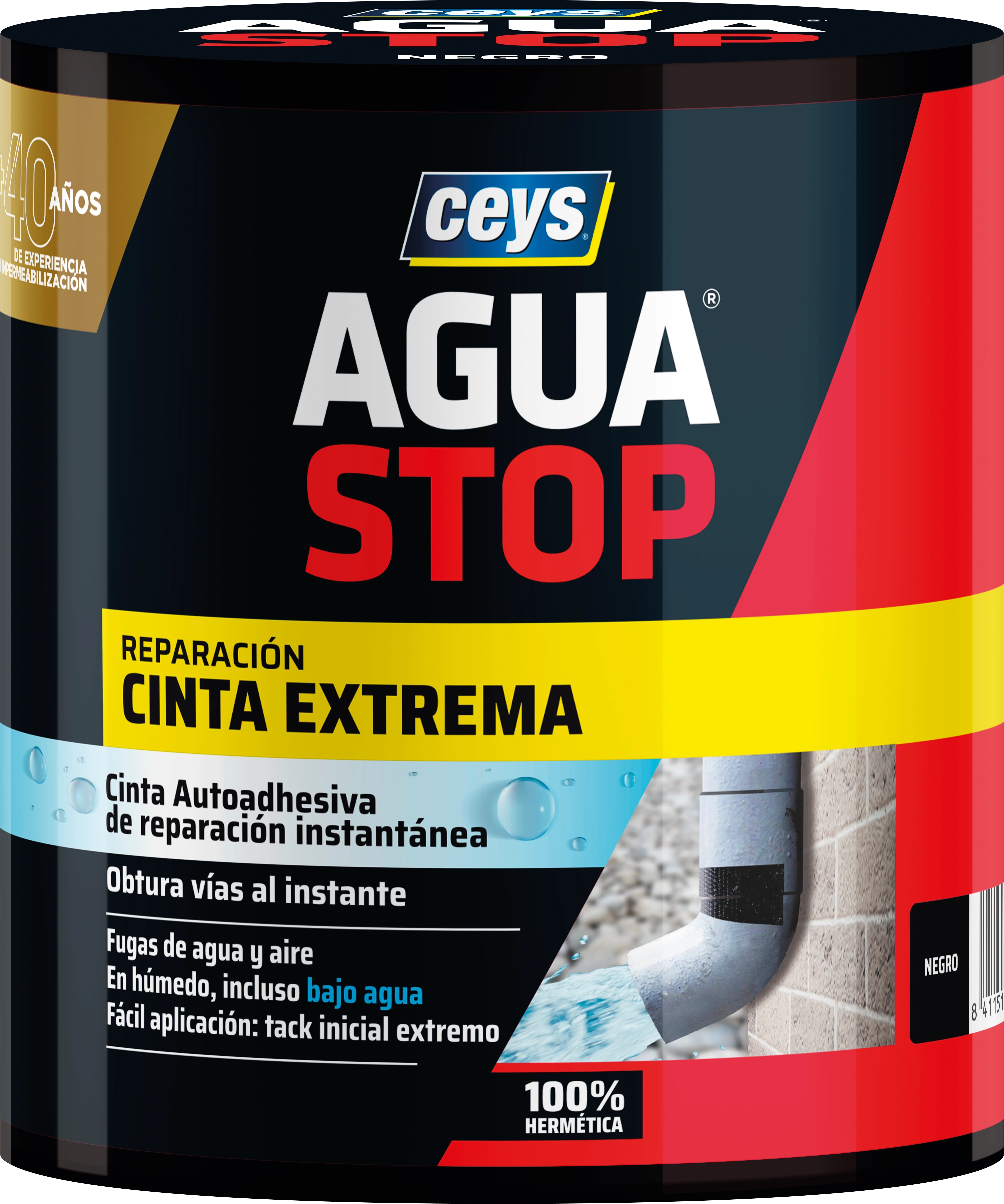 AGUASTOP CINTA EXTREMA INSTANTÁNEA es una banda autoadhesiva impermeable que actúa como barrera flexible y fuerte al agua y al vapor. Idónea para reparaciones de emergencia. Puede unir, sellar y reparar cualquier tipo de material (hormigón, cemento, PVC, metal, teja y ladrillo) y se puede aplicar en húmedo incluso en inmersión.