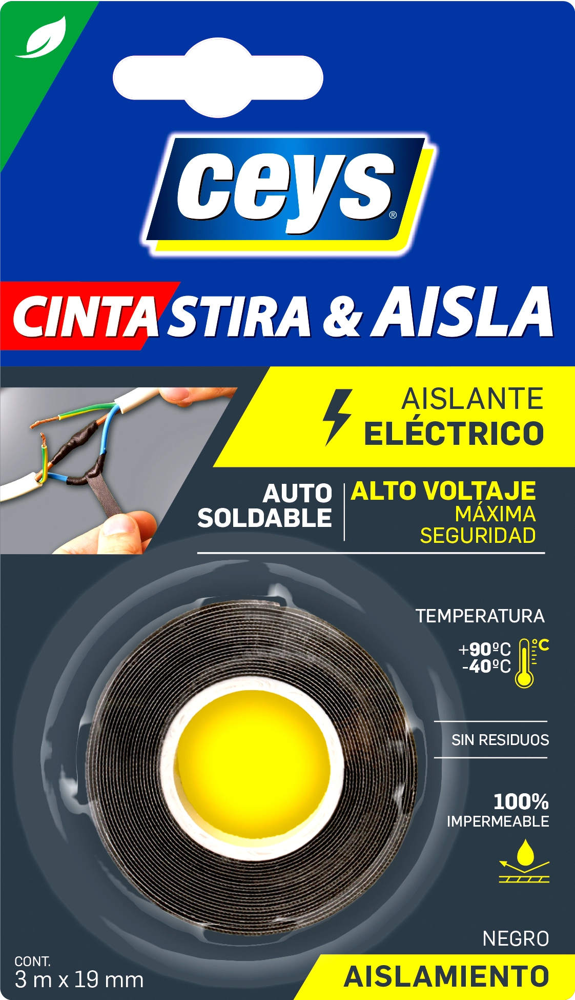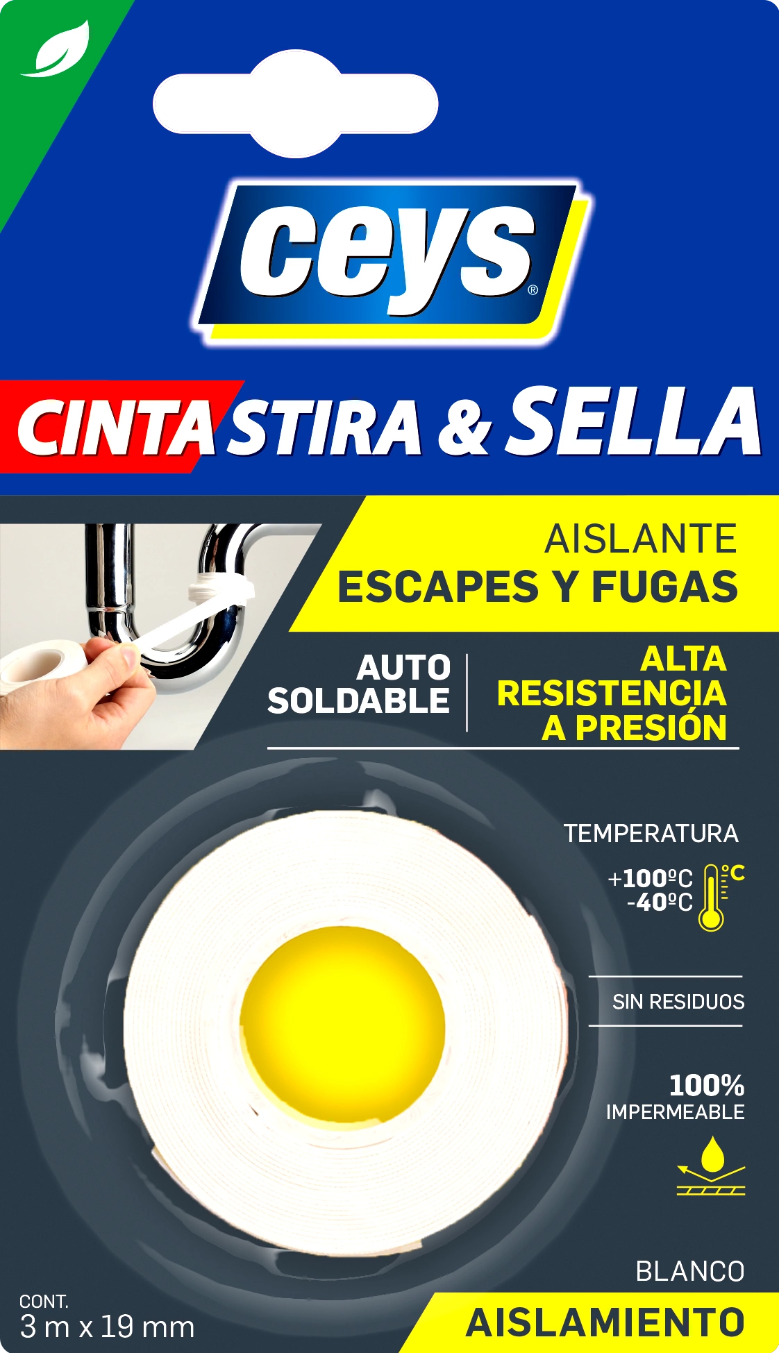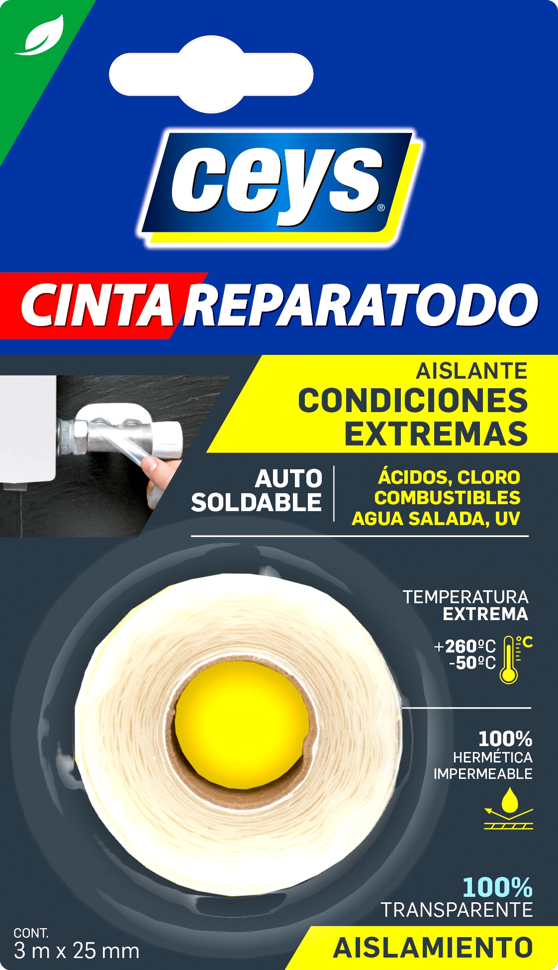 Autosoldable con tecnología Autovulcanizante: la cinta se une consigo misma formando una sola capa, compacta, 100% impermeable, resistente a la presión y apta para todos los materiales.
