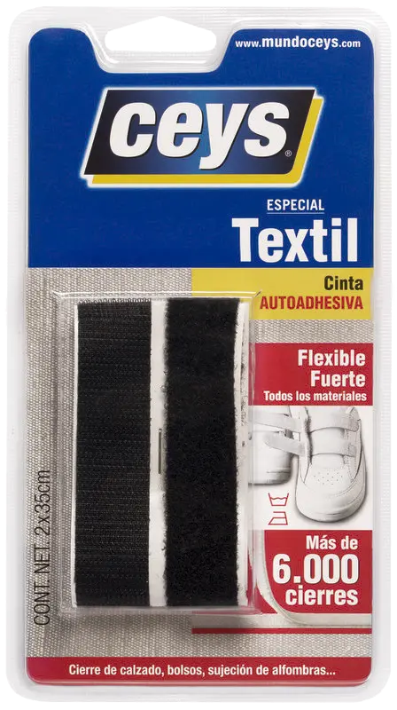 Cinta textil que puede abrirse y cerrarse más de 6.000 veces. Adhiere sobre cualquier tipo de material sin necesidad de coser y se puede pegar, coser, grapar y clavar proporcionando uniones cómodas y duraderas.