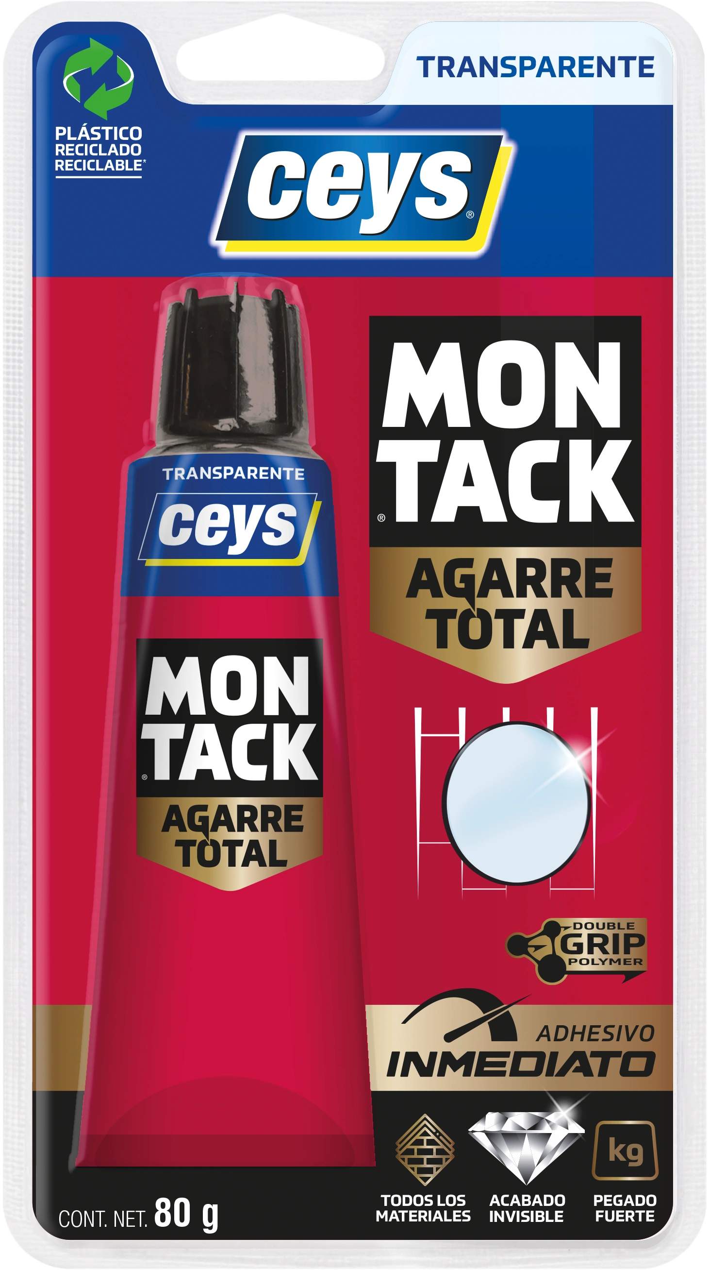 Adhesivo de montaje transparente de Agarre Total, para fijar de forma RESISTENTE y FÁCIL. Especialmente indicado para aplicaciones que requieran transparencia como fijación en cristal o vidrio, gracias a sus acabados limpios.