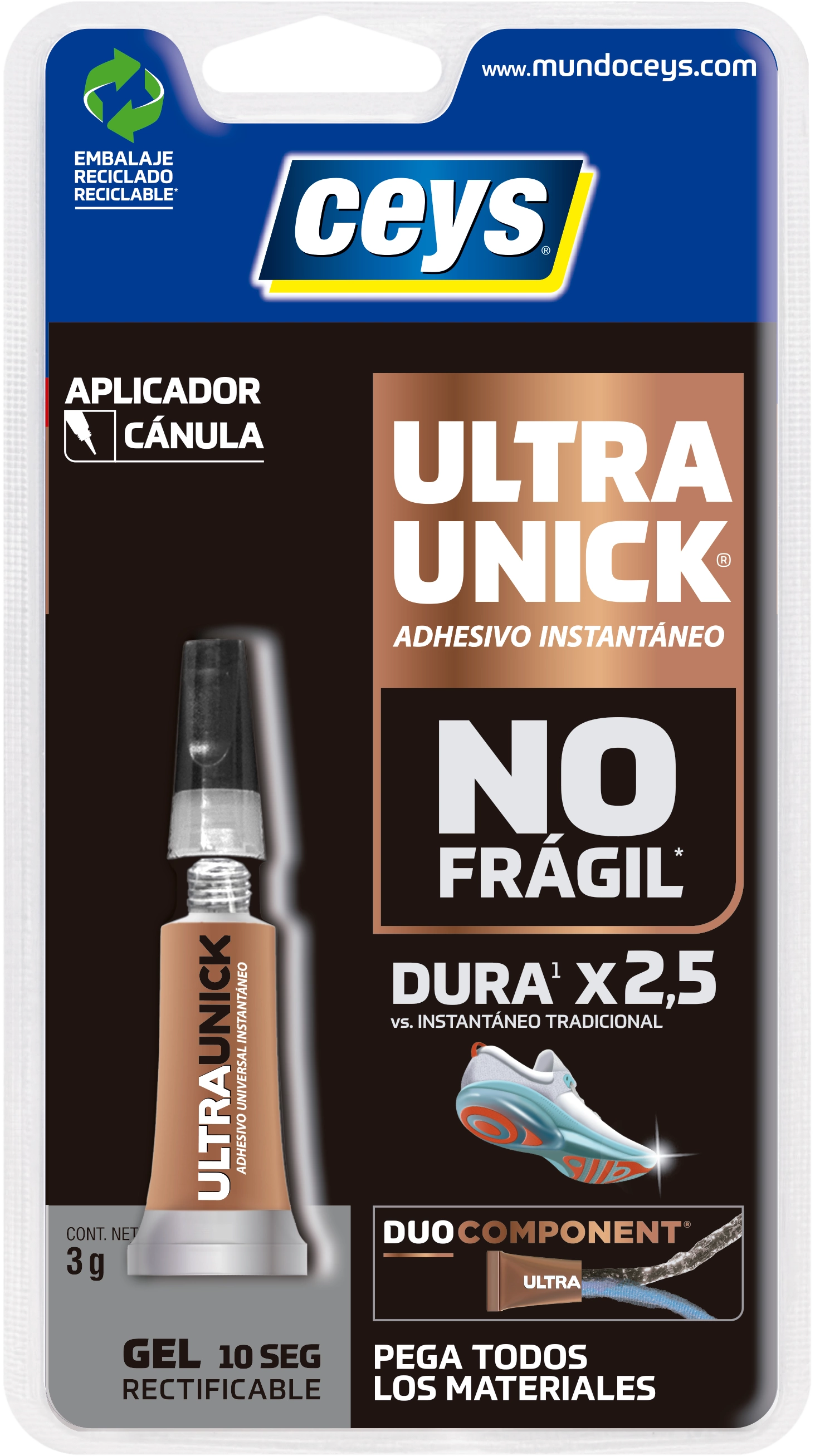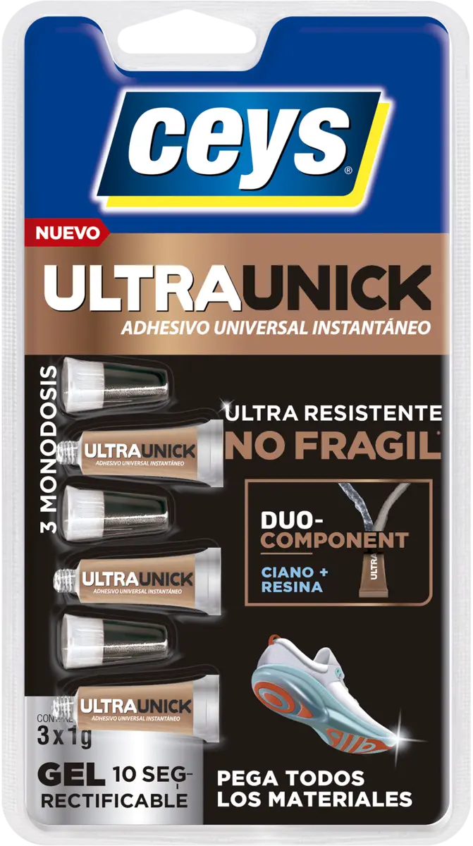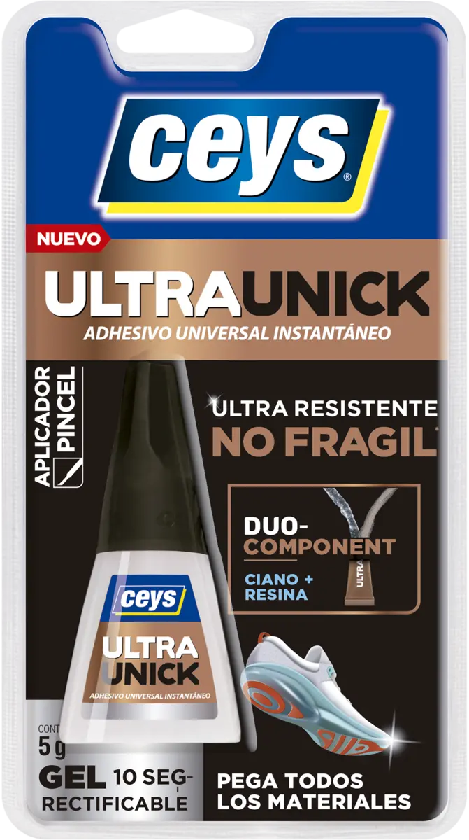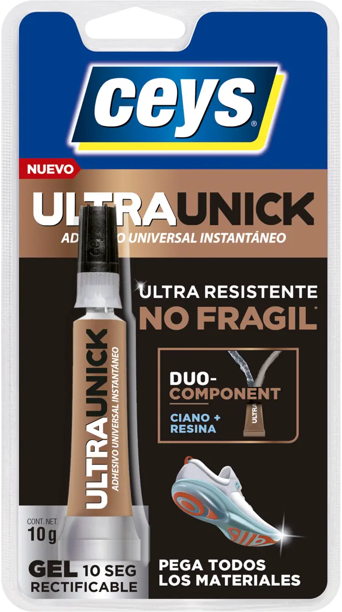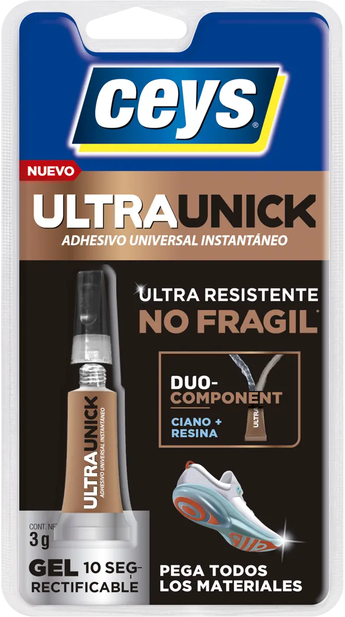 CEYS ULTRAUNICK GEL es el adhesivo universal instantáneo NO FRÁGIL, ultra fuerte, ultra rápido y seguro. Proporciona una unión perfecta en 10 segundos*. Pega todos los materiales**.