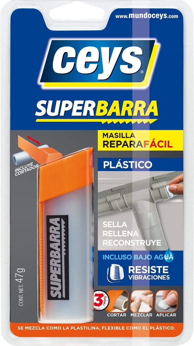 Es una masilla pegamento que sella, rellena y reconstruye todo tipo de plástico*.